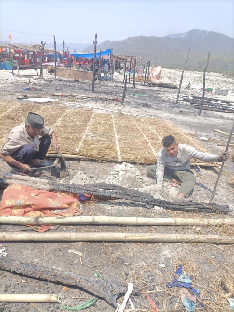 घटनास्थल पर पीड़ित दुकानदार अपने हाथों से राख साफ कर छप्पर बना रहे थे।