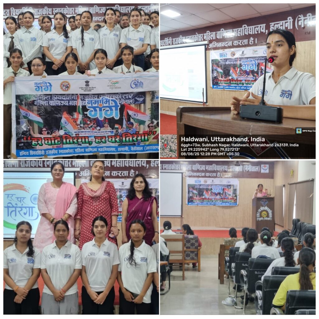 यह हमारी अस्मिता और गौरव का प्रतीक है। नोडल अधिकारी नमामि गंगे डॉ0 रितुराज पंत ने बताया कि “राज्य स्वच्छ गंगा मिशन, नमामि गंगे उत्तराखंड द्वारा 8 अगस्त से हर घर तिरंगा कार्यक्रम का आयोजन प्रदेशभर में किया जा रहा है। इसी क्रम में हमारे महाविद्यालय में यह प्रतियोगिता आयोजित की गई, ताकि यह समझा जा सके कि आज की पीढ़ी हमारे राष्ट्रीय ध्वज के प्रति क्या सोच रखती है। महाविद्यालय की प्राचार्य प्रो0 आभा शर्मा ने अपने संबोधन में कहा कि दीक्षारंभ कार्यक्रम के अंतिम दिवस विज्ञान संकाय के प्राध्यापकों के द्वारा छात्राओं को उपलब्ध संसाधनों के बारे में बताया गया साथ ही हर घर तिरंगा कार्यक्रम के विषय में भी छात्राओं को रुबरु करवाया गया।